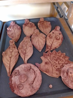 Za použití glazur, fixů na vypálenou hlínu, burelu a dalších možností dokončují své výtvory.